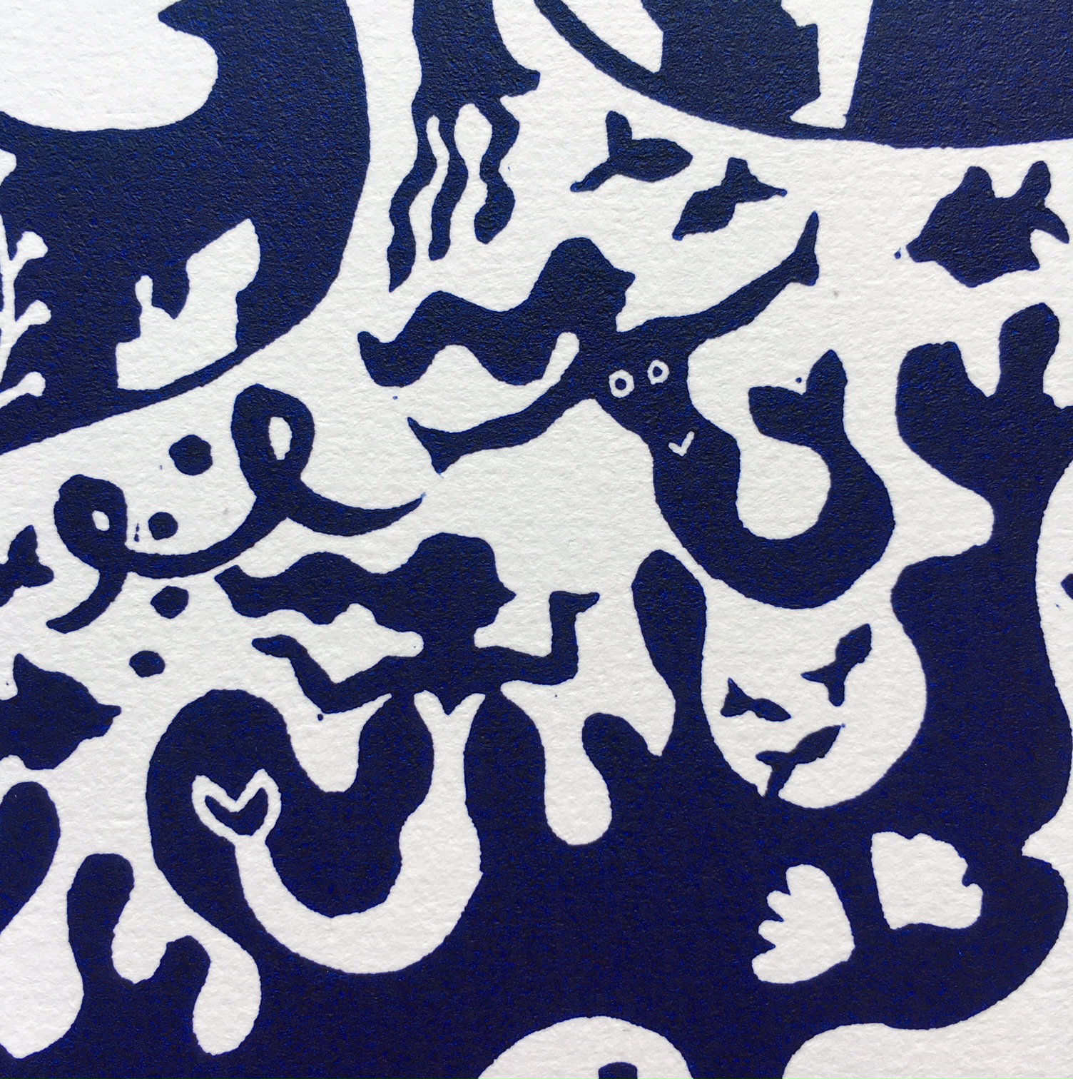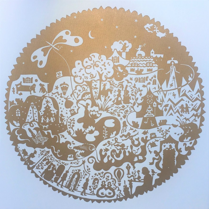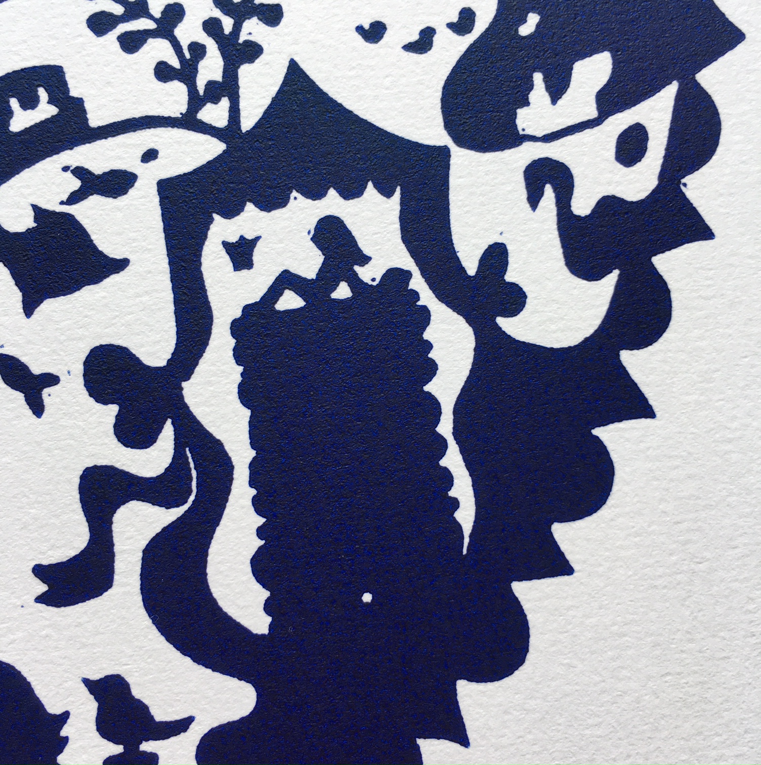This linocut is inspired by a magical ride at Copenhagen’s Tivoli Gardens, Den Flyvende Kuffert (The Flying Trunk). Visitors climb inside an enchanted suitcase and are taken on a wondrous tour of Hans Christian Andersen’s fairytale scenes, including (clockwise from the bottom):