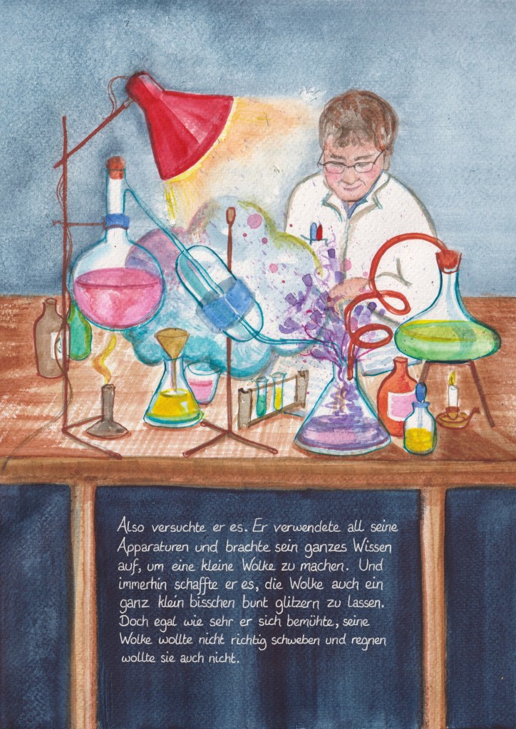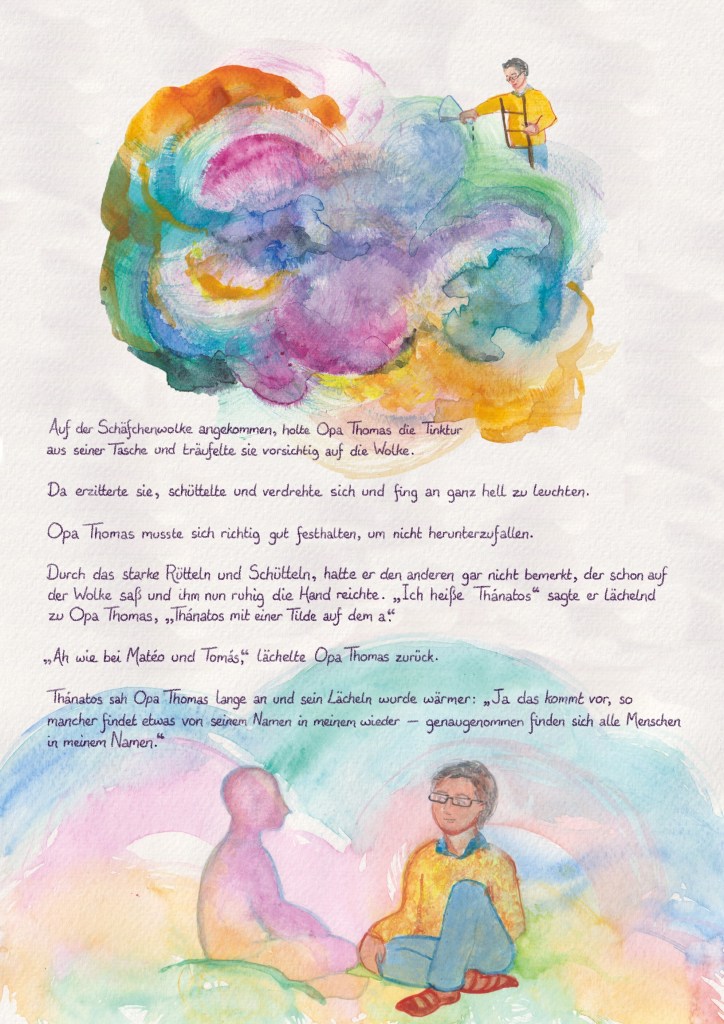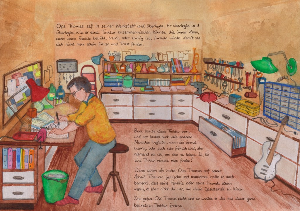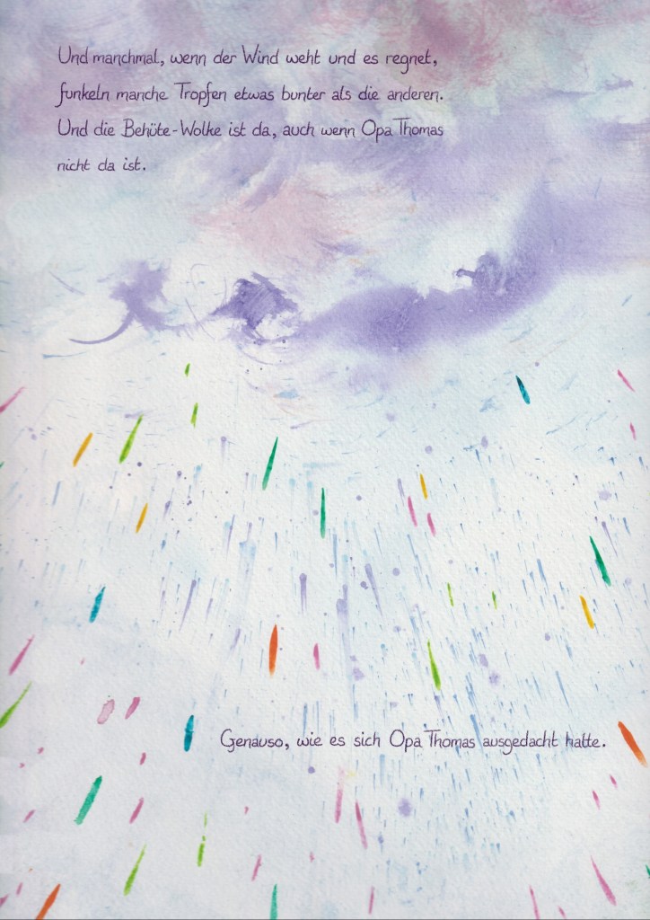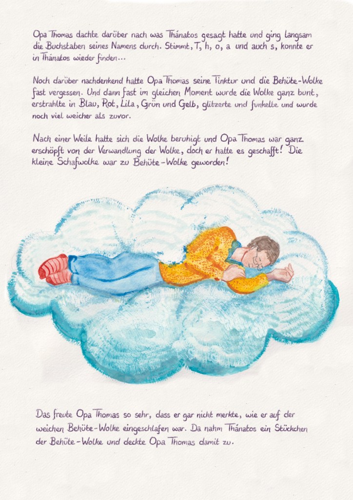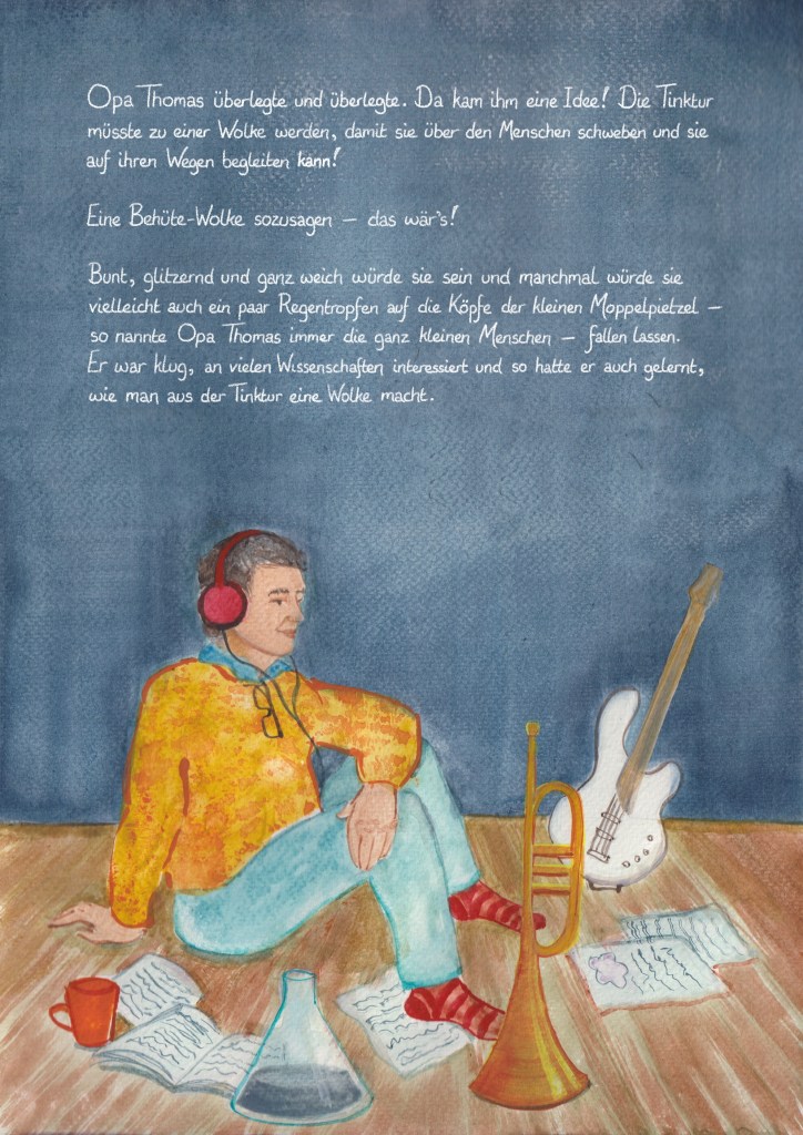 Watercolour illustrations for a children’s book written by Bettina Porstmann for her nephews, to introduce them to their grandfather Opa Thomas who they never got to meet. Opa Thomas was a chemist, musician and family man, and in this tale also slightly magical. He creates a cloud of protection to follow his family and surround them with love after he’s gone.