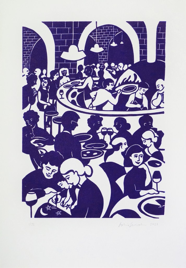 Beautiful linocuts! The blue pizza is my favorite, is that one for sale?