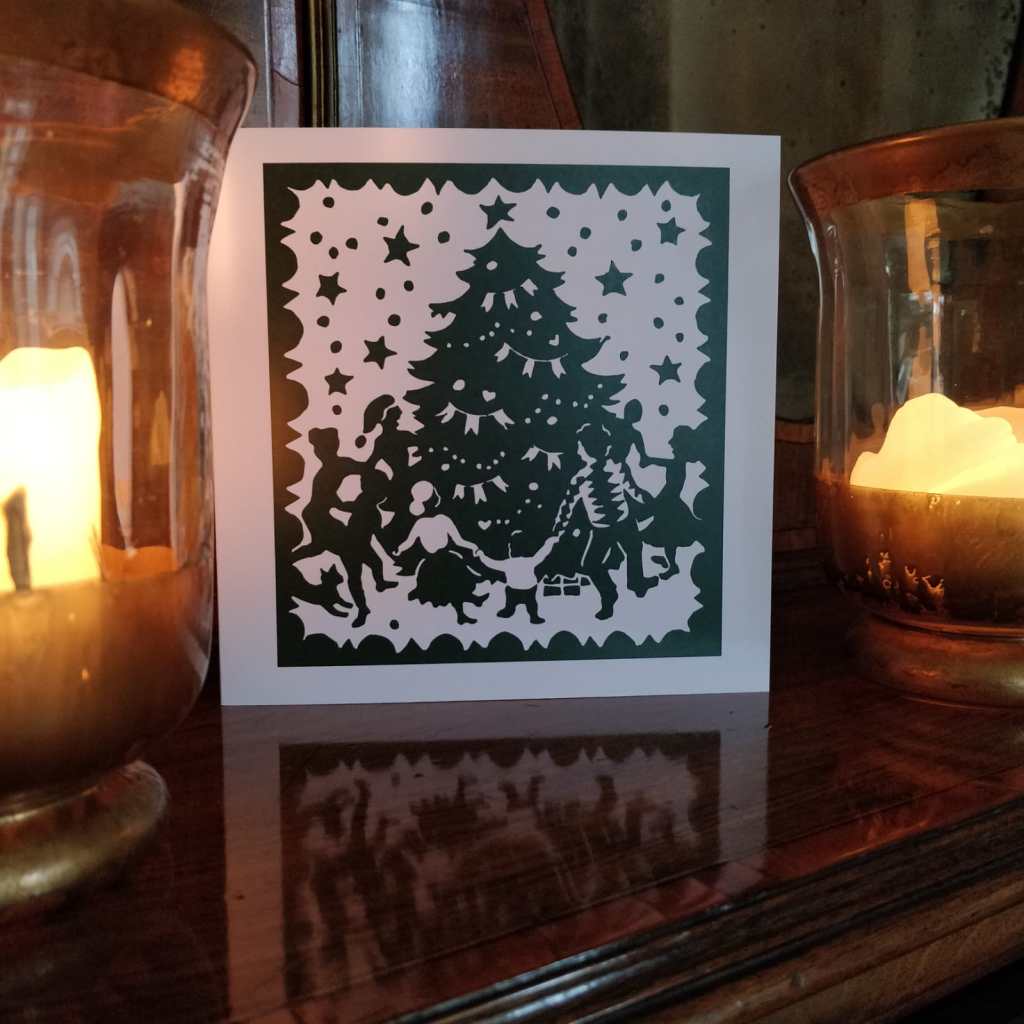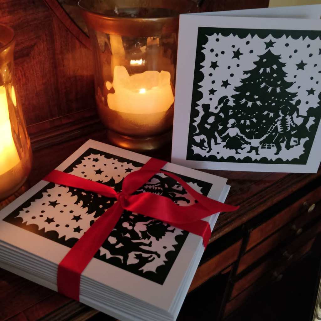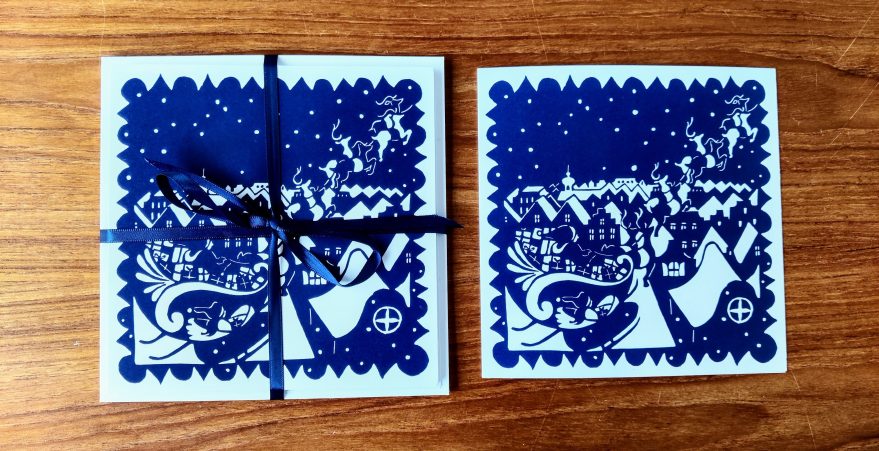 Printed on 350gsm recycled paper, these Christmas cards (printed out-of-house on a Heidelberg lithographic press) feature a linocut inspired by a favourite Danish painting, Viggo Johansen’s Glade Jul (1891).